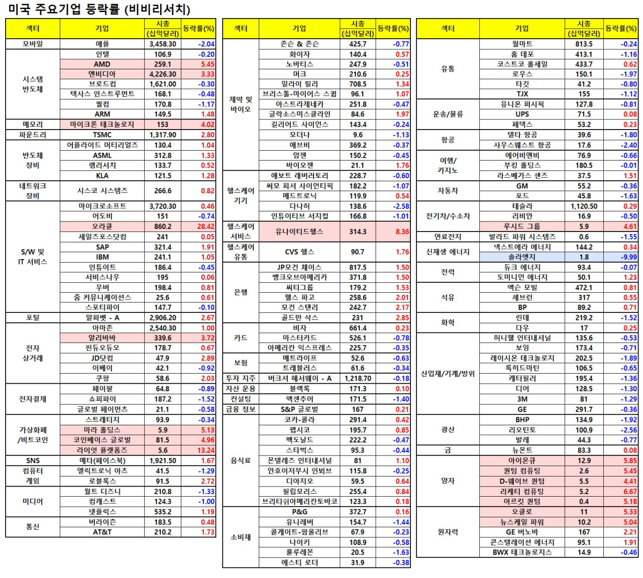 - AMD(+2.91%)도 상승. 반면 여타 반도체 기업들은 부진을 보이는 등 과거와 달리 업종내에서도 종목의 집중화가 진행.