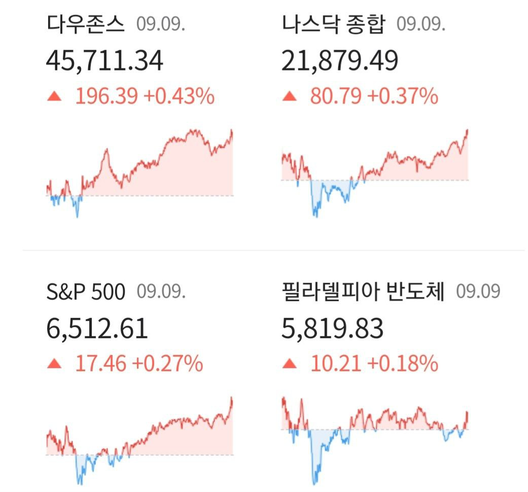 - 한편, 애플(-1.48%)이 아이폰 17 공개 후 매물을 내놓으며 하락했지만 장 마감 앞두고 엔비디아(+1.46%)의 상승이 확대되며 지수 상승이 확대된 점도 특징(다우 +0.43%, 나스닥 +0.37%, S&P500 +0.27%, 러셀2000 -0.55%, 필라델피아 반도체 지수 +0.18%)