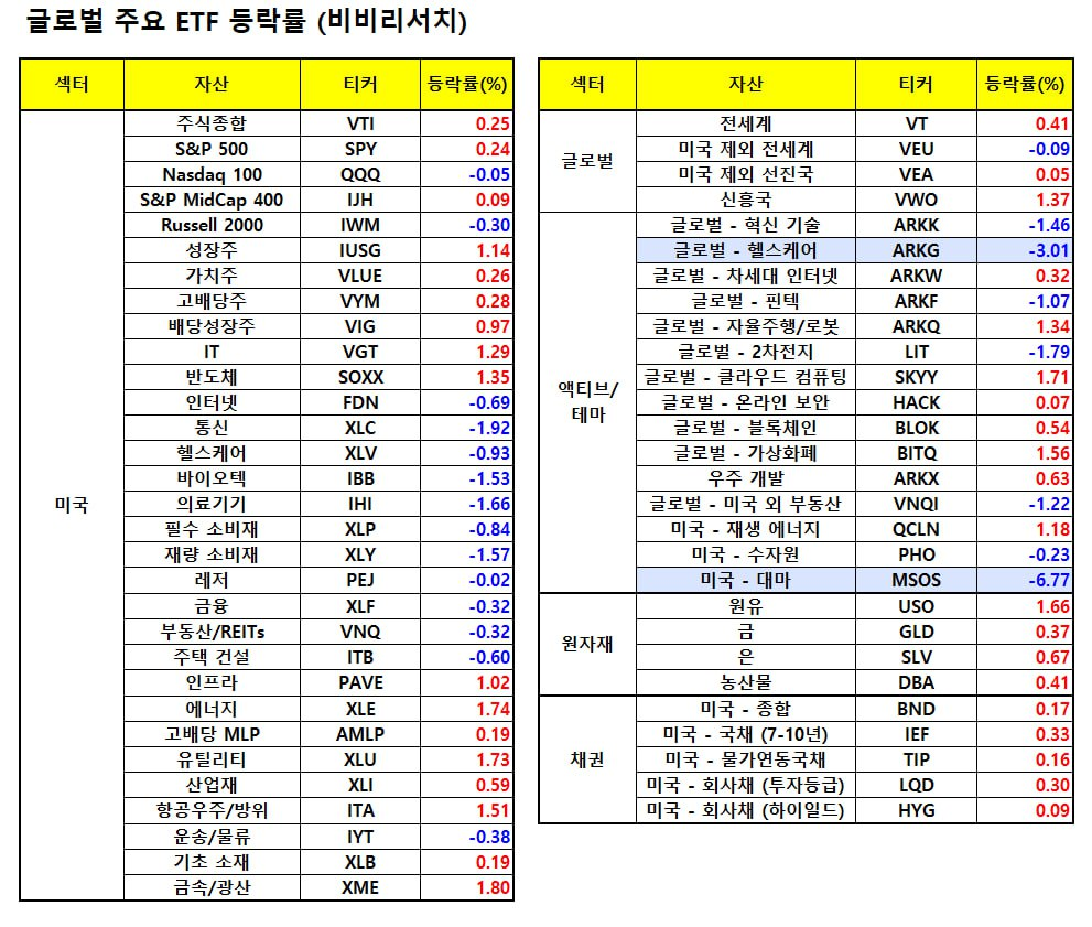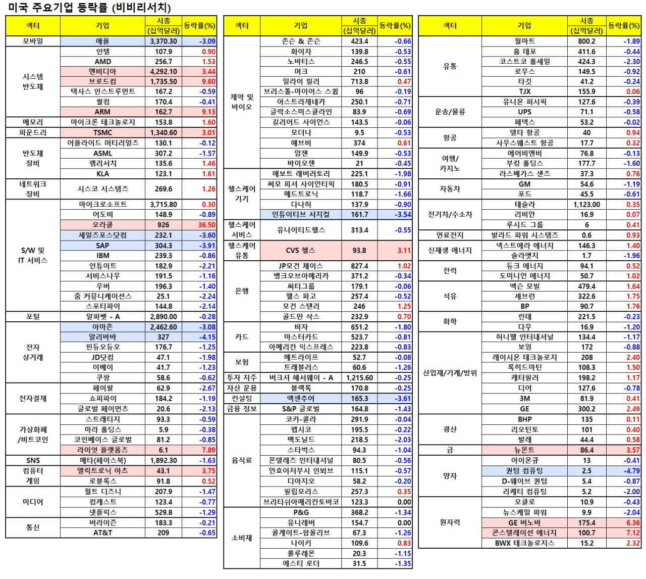 지난밤 미국 주요 종목 동향 (시간외 반영)