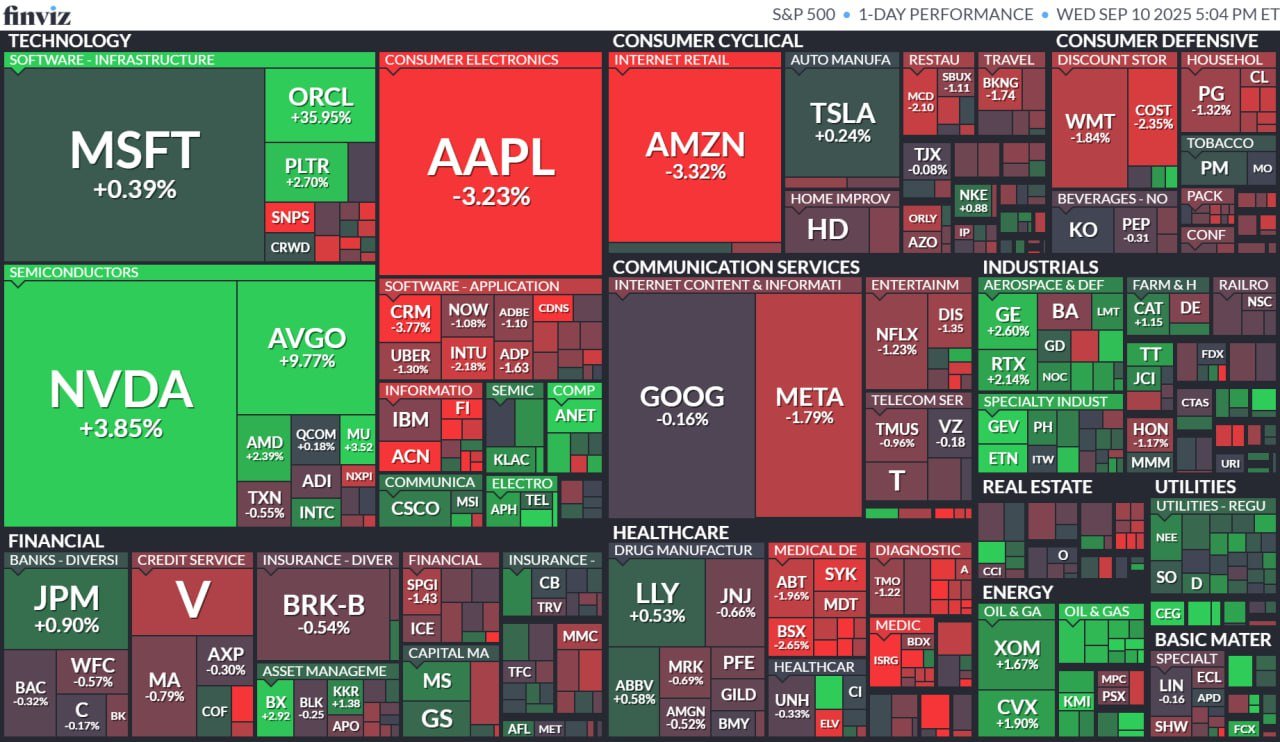 • [생산자물가지수(PPI) 둔화가 투심을 안정 시킨 가운데 오라클의 급등(+35.5%)이 AI 관련주 강세를 이끌었습니다.