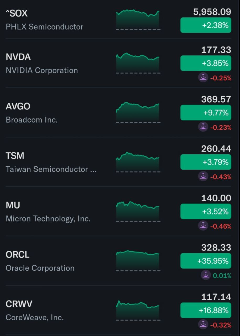 • 슈퍼마이크로컴퓨터(+2.31%)도 강세를 보였고 클라우드 서비스 기업인 코어위브(+16.88%)도 급등.