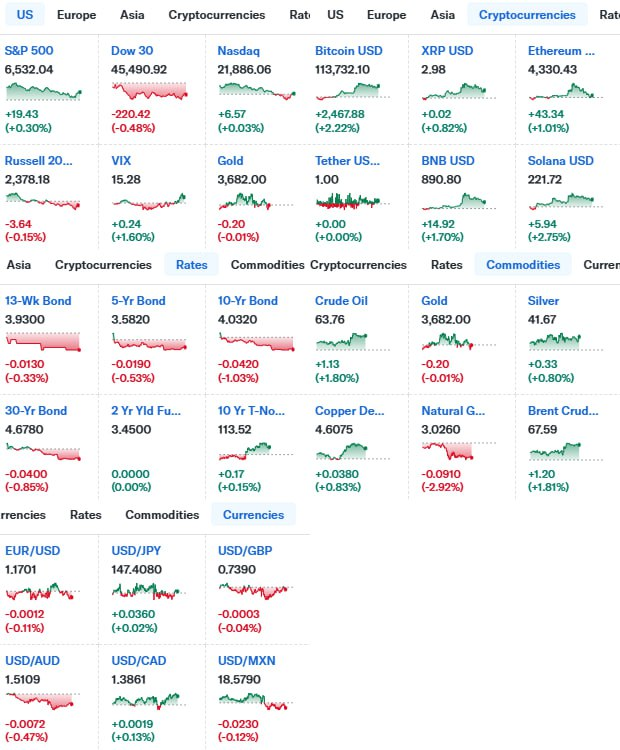 • S&P 500 6,533.39 (+0.32%), 나스닥 21,896.04 (+0.08%), 다우 45,505.21 (-0.45%) 마감.