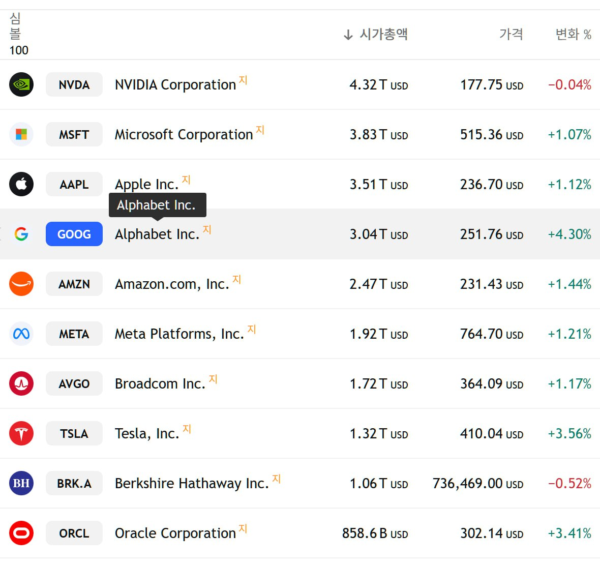 - 구글 알파벳은 4.3% 크게 올랐는데 이번 상승으로 엔비디아, 마이크로소프트, 애플과 함께 시총 3조 달러 클럽에 합류했습니다.