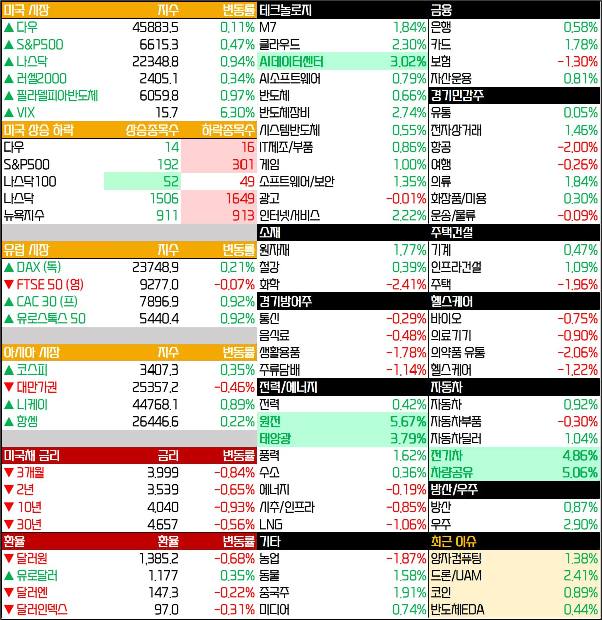 - 아이폰17 출시를 앞두고 애플은 1.12% 올랐고, 아마존(1.44%), 메타(1.21%) 등도 상승함. 엔비디아는 0.04% 하락 마감함.