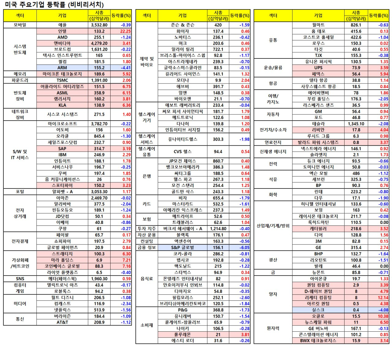 - 인텔과 CPU 시장에서 경쟁하는 AMD(-0.78%)나 엔비디아와 CPU 개발을 협력해온 ARM(-4.45%)은 부진.