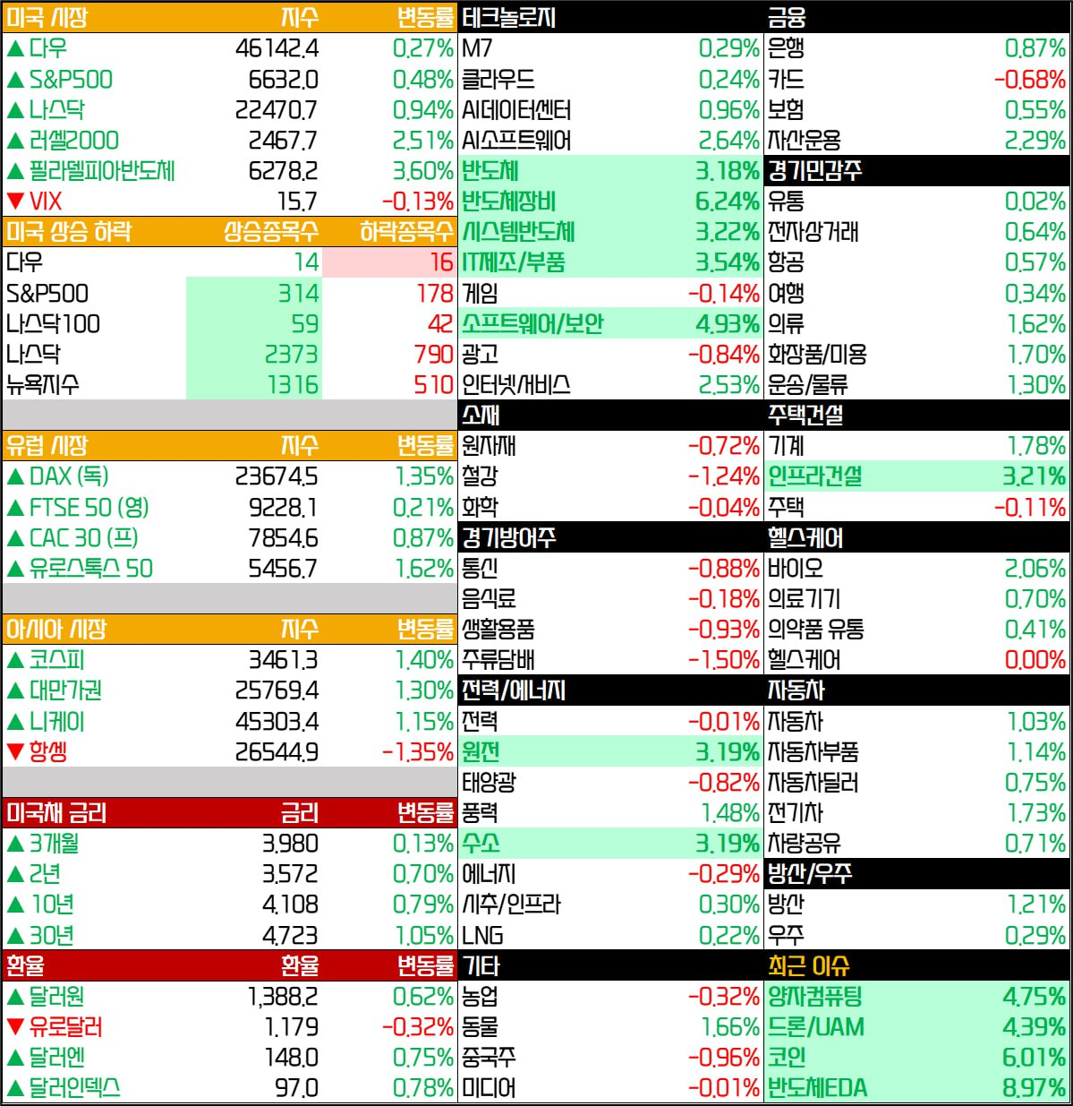 - 그런 가운데 엔비디아(+3.54%)가 인텔(+22.77%)과 협력한다는 소식에 반도체 기업 중심으로 쏠림이 집중되며 나스닥의 상승이 확대.