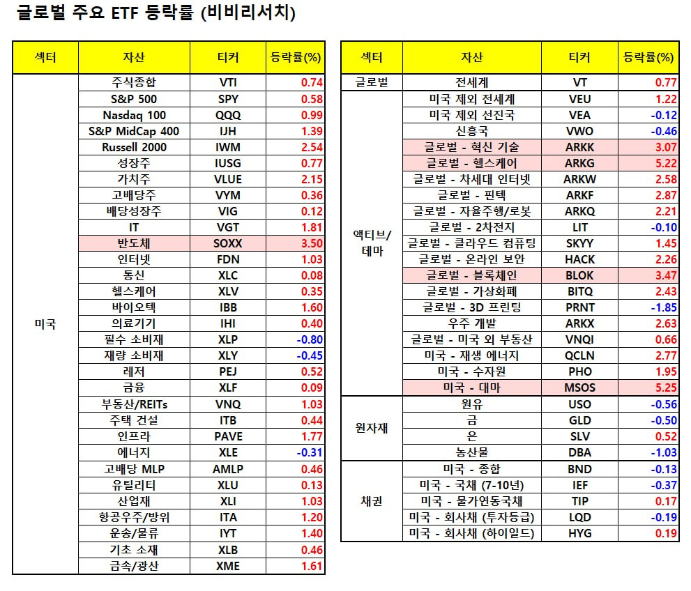 - 브로드컴(-0.24%)도 부진. 마이크론(+5.57%)은 오늘은 웨드부시가 총 이익률이 강화되고 있어 목표주가를 200달러로 상향 조정하자 강세.