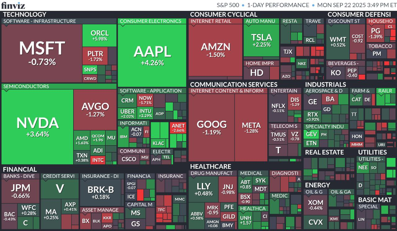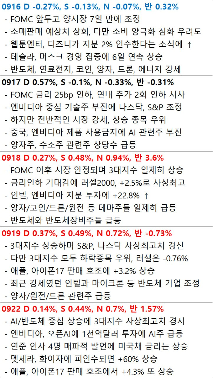 - 주말에 나온 트럼프의 H1-B 비자 수수료 $1M 부과로 인해 시장 약세 출발. 그러나 장시작 후 엔비디아와 오픈AI 의 대형 딜이 발표되며 시장 상승 전환