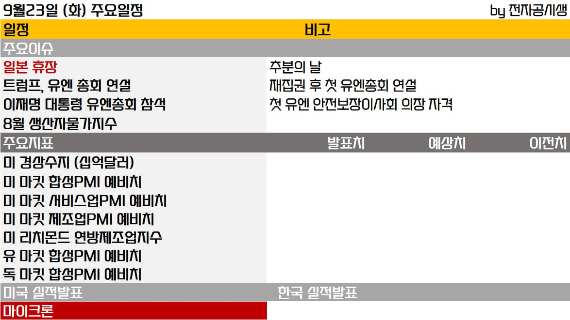 글로벌 PMI가 발표되고, 파월 의장을 포함한 여러 연준 인사들의 발언이 이어집니다. 장 마감 후에는 마이크론 실적 발표가 있습니다