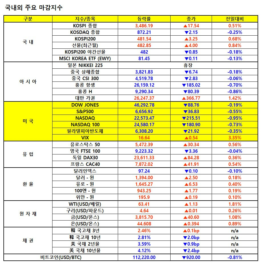 - 파월 연준의장의 고평가 언급 후 코어위브(-1.76%), 마벨테크(-1.20%), 유아이패스(-4.64%), C3AI(-2.11%) 등 AI 서버나 서비스 기업들 대부분 하락.