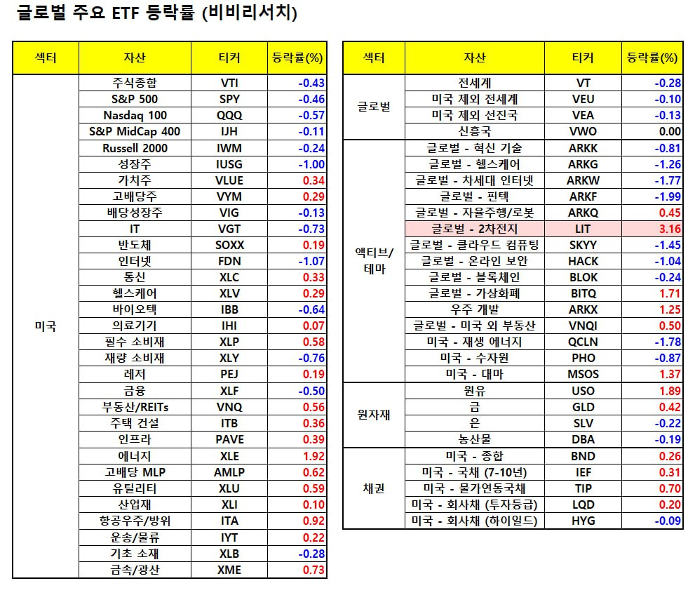 - 충전업체 블링크차징(-1.85%)은 허브젝과 협력해 북미 전역에 충전 네트웍을 확장한다고 발표하자 3% 넘게 상승했지만, 차익 실현 매물 출회되며 상승 반납.
