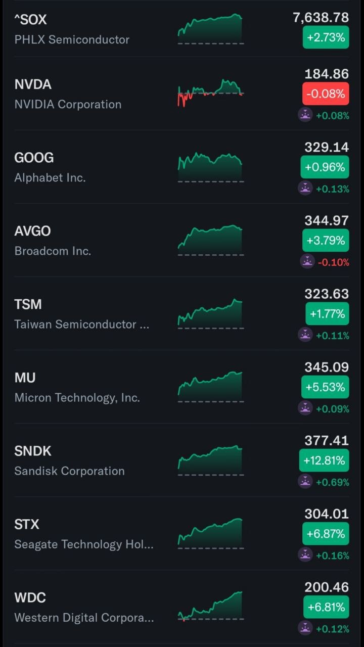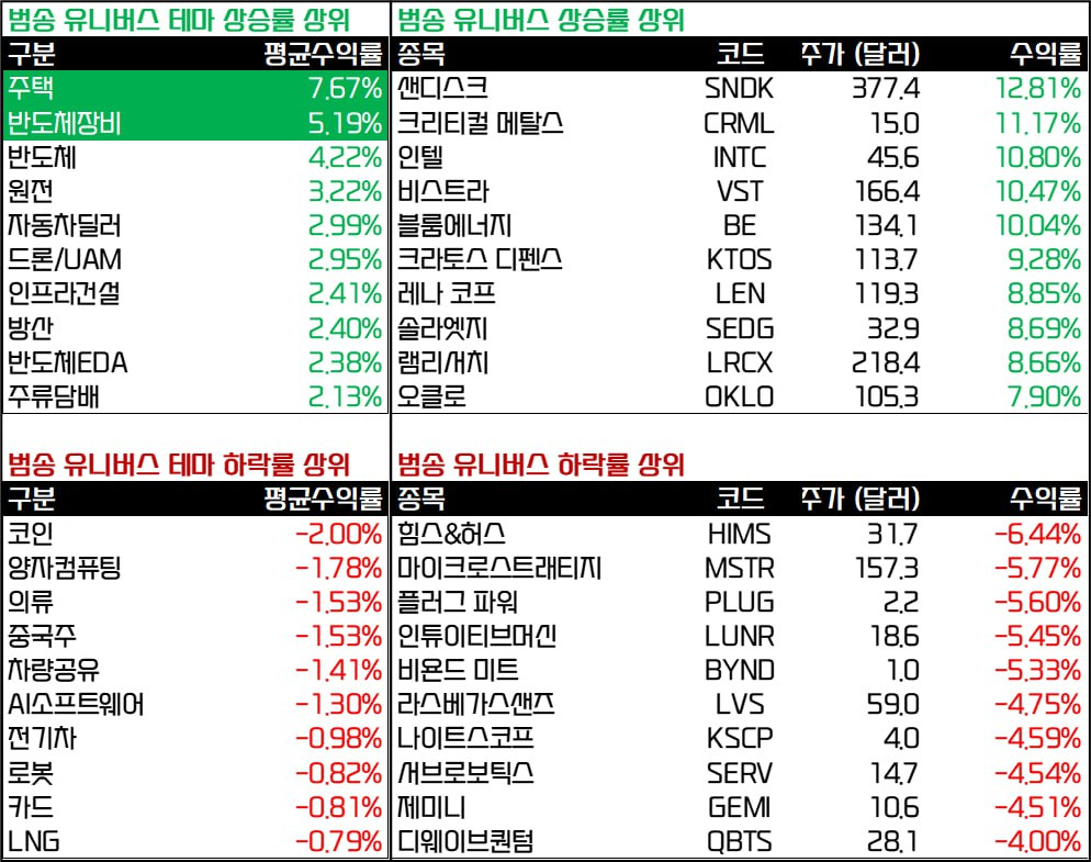 - 웨스턴디지털(+6.81%), 시게이트(+6.87%), 샌디스크(+12.81%) 등 스토리지 기업들도 투자심리 개선 속 급등.