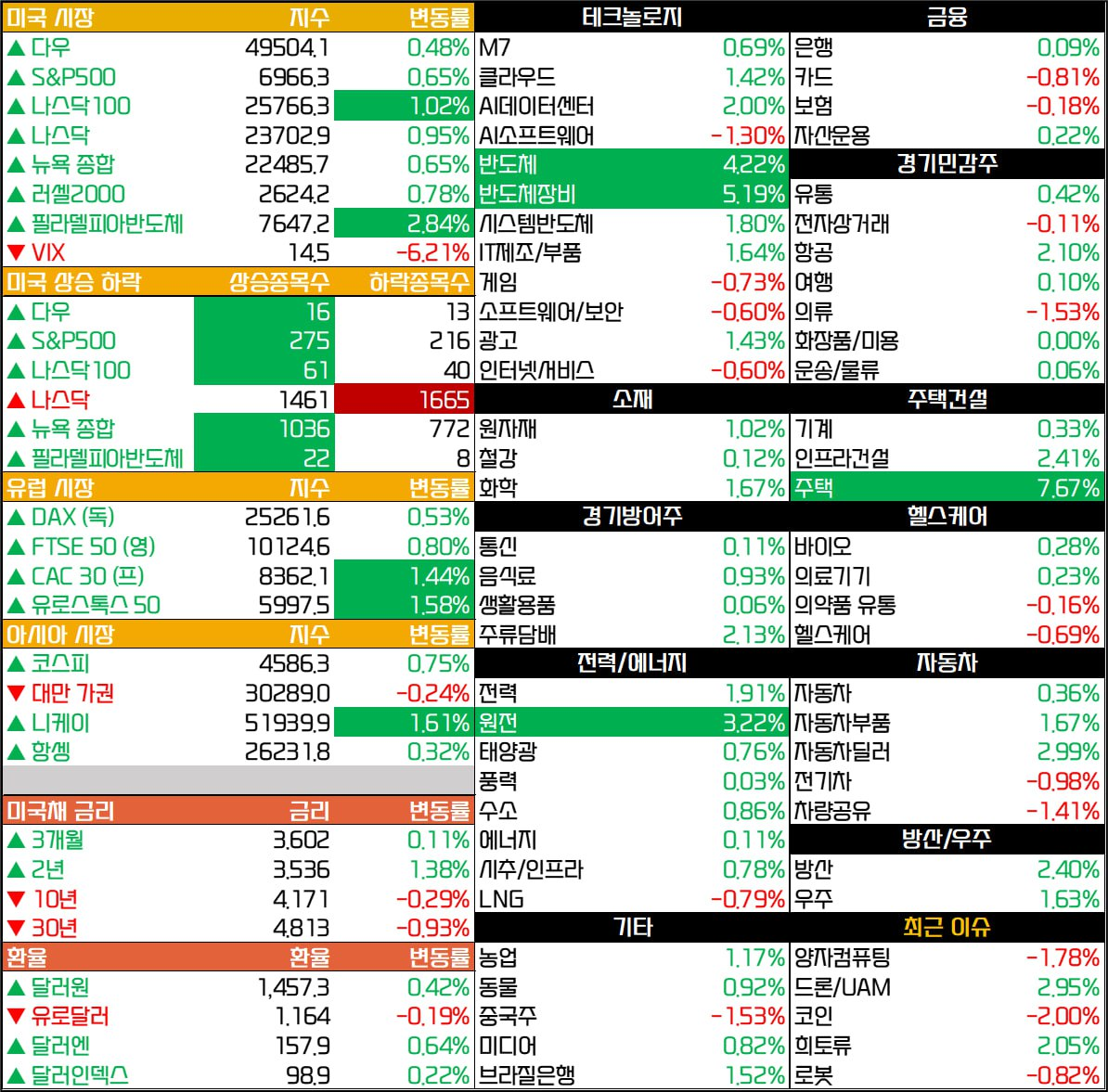 - AMAT(+6.94%), ASML(+6.66%)등 반도체 관련 기업들이 큰 폭으로 상승. ASML에 대한 투자의견 상향 소식도 영향.