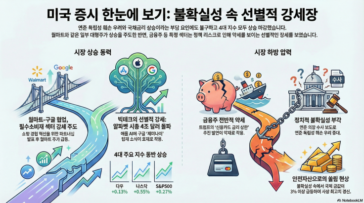- 이번 장세는 정치·제도적 불확실성과 금리 상승이라는 부담 속에서도, 월마트를 중심으로 한 필수소비재와 일부 대형 기술주가 지수 방어 및 상승을 이끈 흐름으로 요약된다.