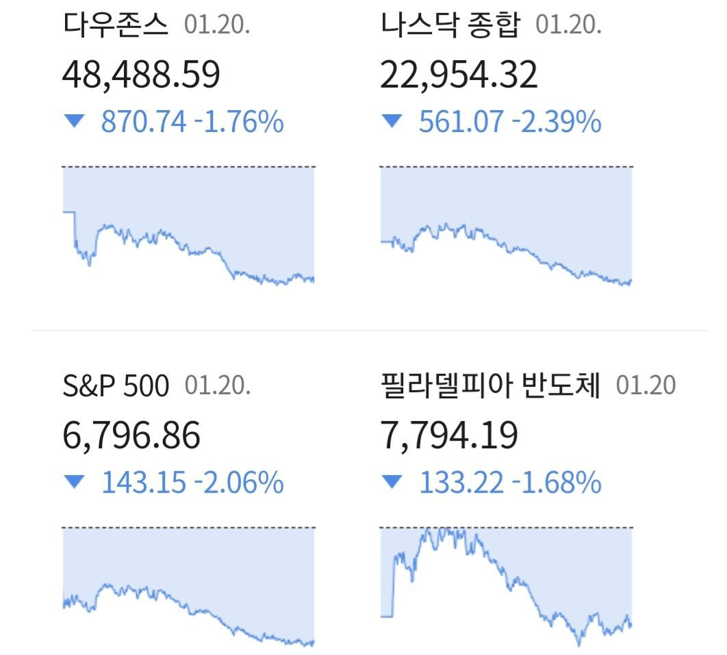 - [뉴욕증시 마감] 다우 870P 급락… 트럼프 ‘그린란드 관세’ 발언에 증시 비명