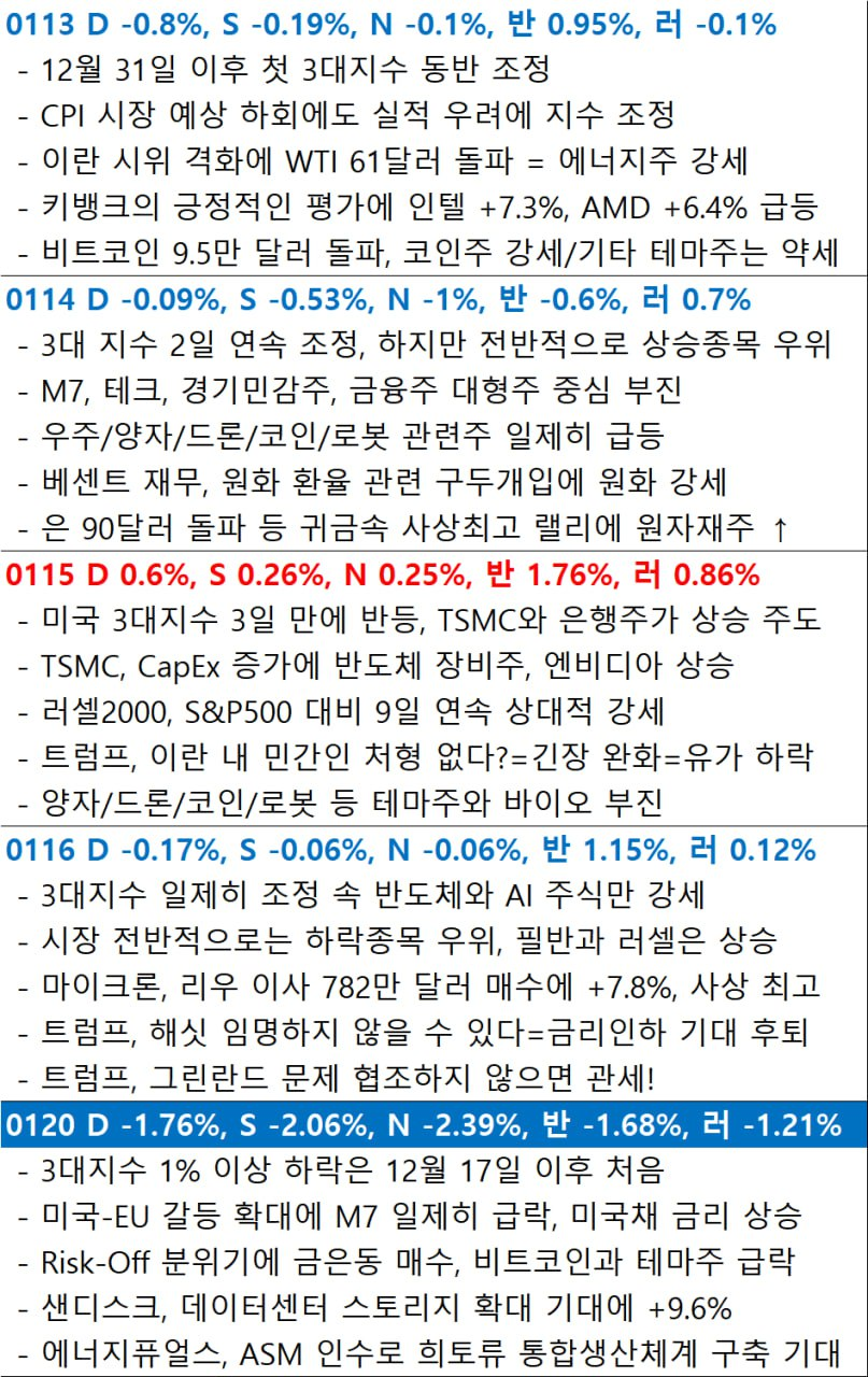- 그린랜드를 둘러싼 트럼프와 유럽 국가들의 관세 부과 및 달러 표기 자산을 매도하는 Sell USA 트레이드로 인한 미국 국채 금리 급등, 일본 금리 급등에 따른 엔 캐리 트레이드 청산 우려가 겹치며 3대 지수 큰 폭으로 하락. 미국 국채 금리가 위험 수위 근처까지 오른 가운데 중소형 러셀 2000이 그나마 가장 선방한 점은 주목할 부분