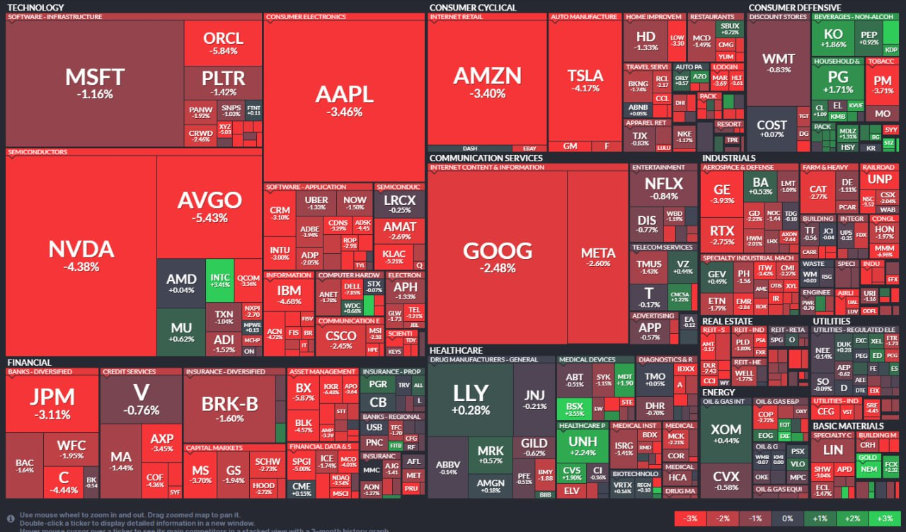 - 업종별 흐름을 살펴보면, S&P 500 내에서는 대형 기술주 비중이 높은 섹터들이 압박을 받았으며 소비재 섹터 내 의류, 여행 관련 종목들도 부진했습니다.