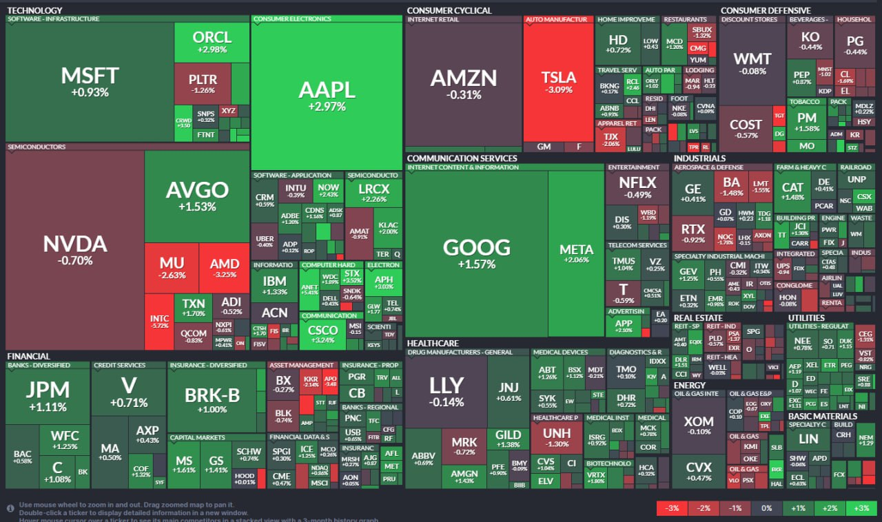 - 마이크로소프트 $MSFT, 애플 $AAPL, 메타 $META, 알파벳 $GOOG 이 상승 주도하며 3대 지수 상승. 러셀 2000 만 하락