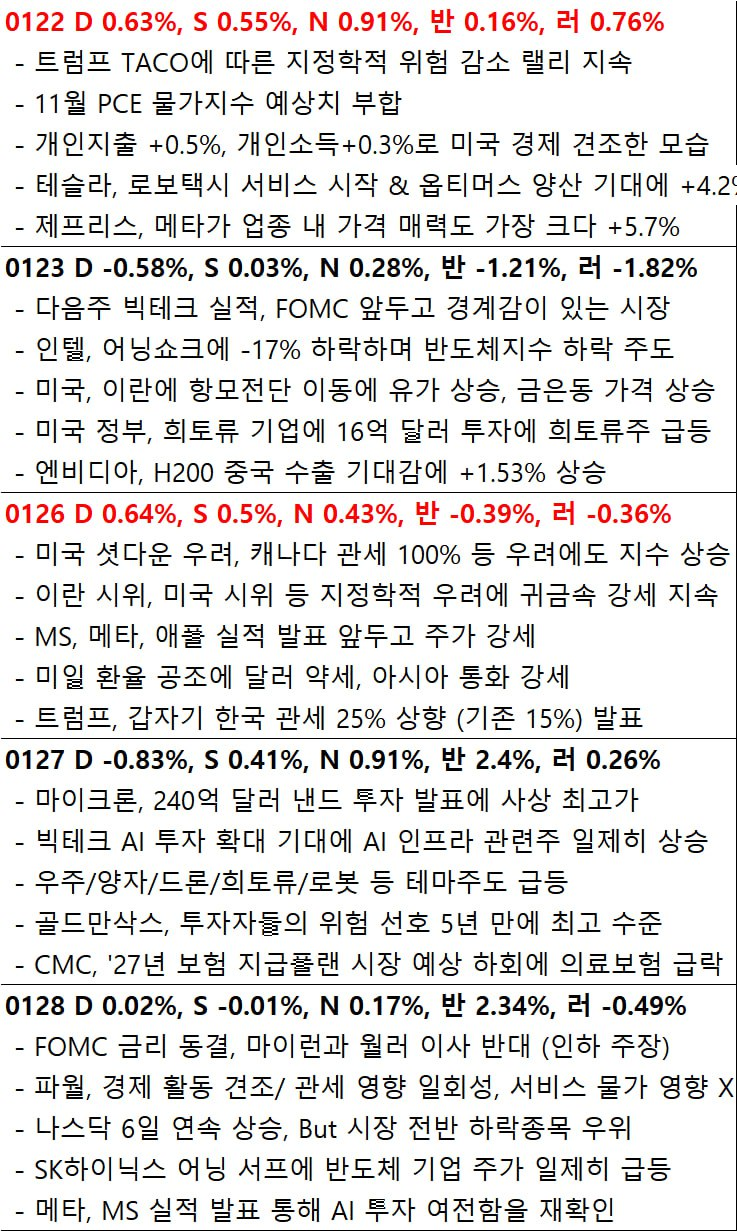 - 예상대로 금리를 동결한 1월 FOMC 는 기자회견에서 파월 의장의 정치적 행보 관련 질문이 초반 집중됐으며 파월 의장이 통화정책 경로를 포함 민감한 질문들에 답변을 피하면서 시장에 미친 영향은 제한적.