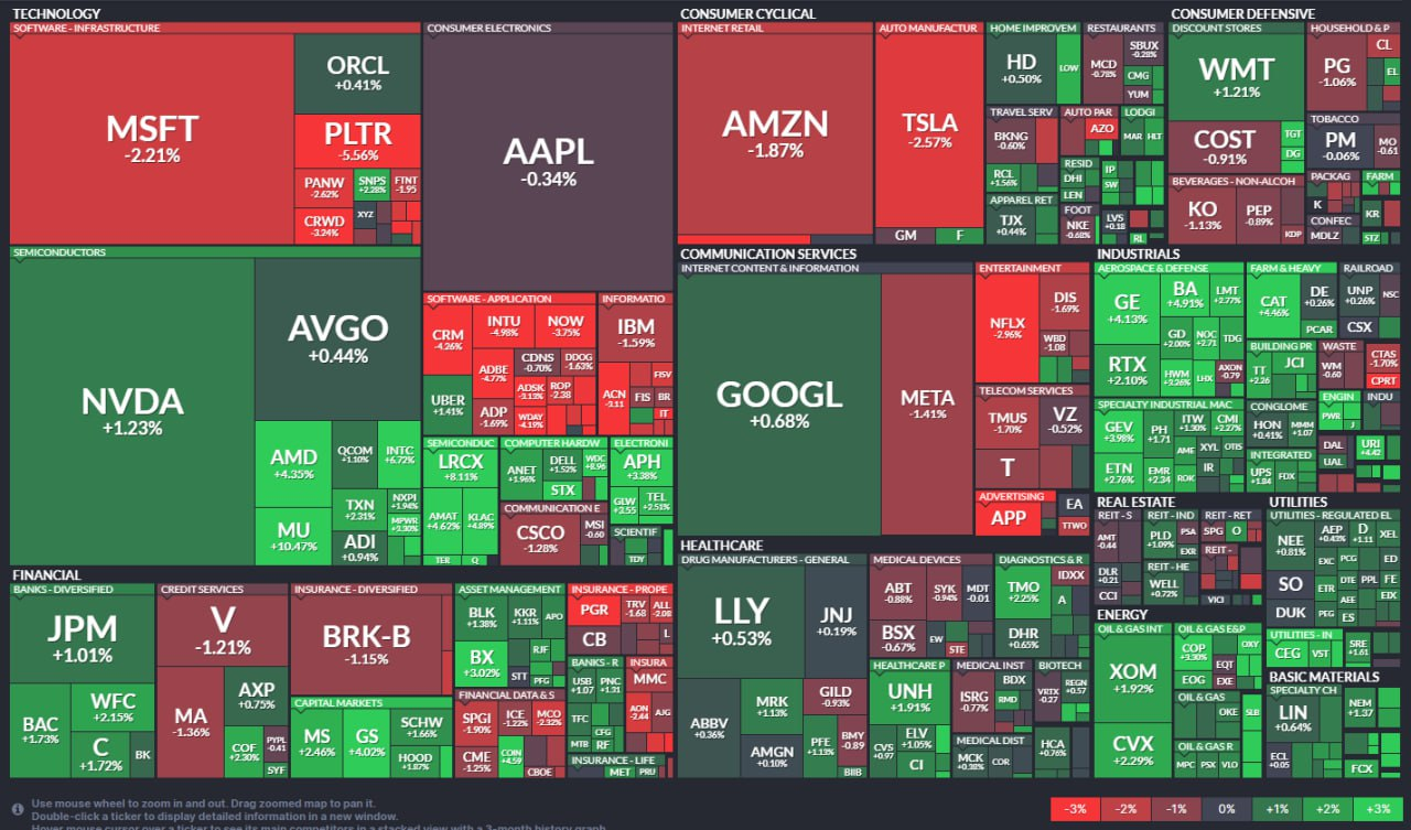 - 그러나 미국의 대표적 AI 소프트웨어 기업인 팔란티어가 -5.56%, 마이크로소프트가 -2.21% 하락하는 등 소프트웨어주가 일제히 하락하자 나스닥 지수는 소폭 하락 마감했다.