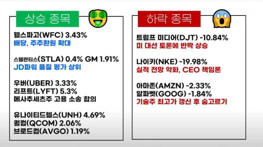 - 나이키(-19.98%)는 부진한 실적과 경기 침체등을 언급하며 향후 전망도 부정적으로 언급하자 급락.