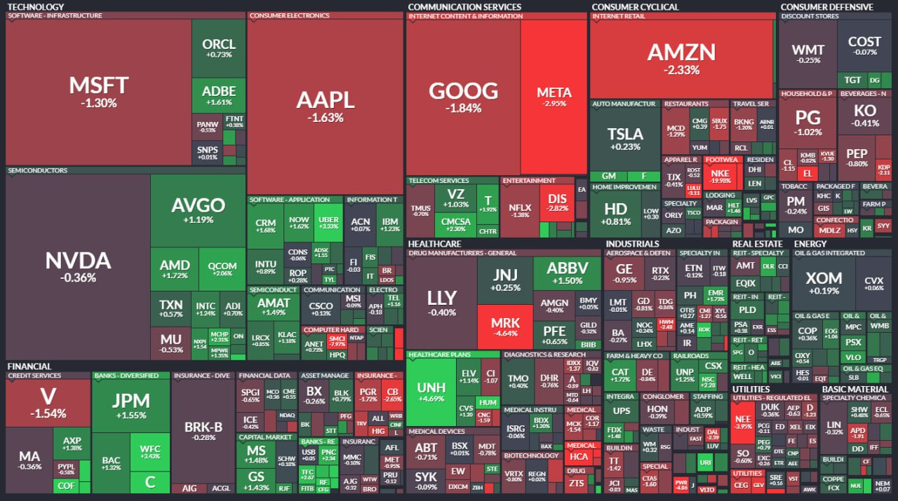 - 다우지수 0.1% 하락, S&P 500 0.4% 하락, 나스닥은 0.7% 하락.