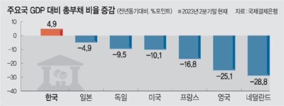 3. OECD 31개국 중 한국만 빚 늘어 → 가계·기업·정부부채를 모두 더한 총부채 사상 처음 6000조 돌파 전망. GDP대비 총부채비율 한국은 4.9%P 증가한 반면 일본(-4.9%P), 미국(-10.1%P), 독일(-9.5%P), 영국(25.1%P) 등은 모두 감소.(문화)▼