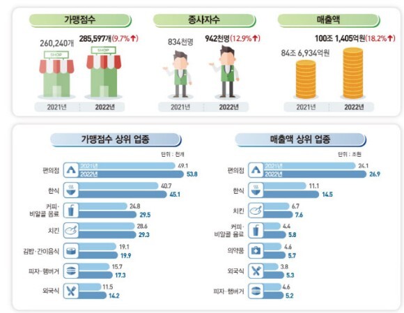 10. ‘프랜차이즈’의 나라 → 작년 프랜차이즈 매출액 100조 돌파. 전년비 18.2% 증가, 역대 최대. 전체 가맹점 수 28만 5597개, 종사자 수는 94만 2000명... 매출액 상위 3개 업종은 편의점(26.8%), 한식(14.4%), 치킨전문점(7.6%) 순.(경향 외)▼