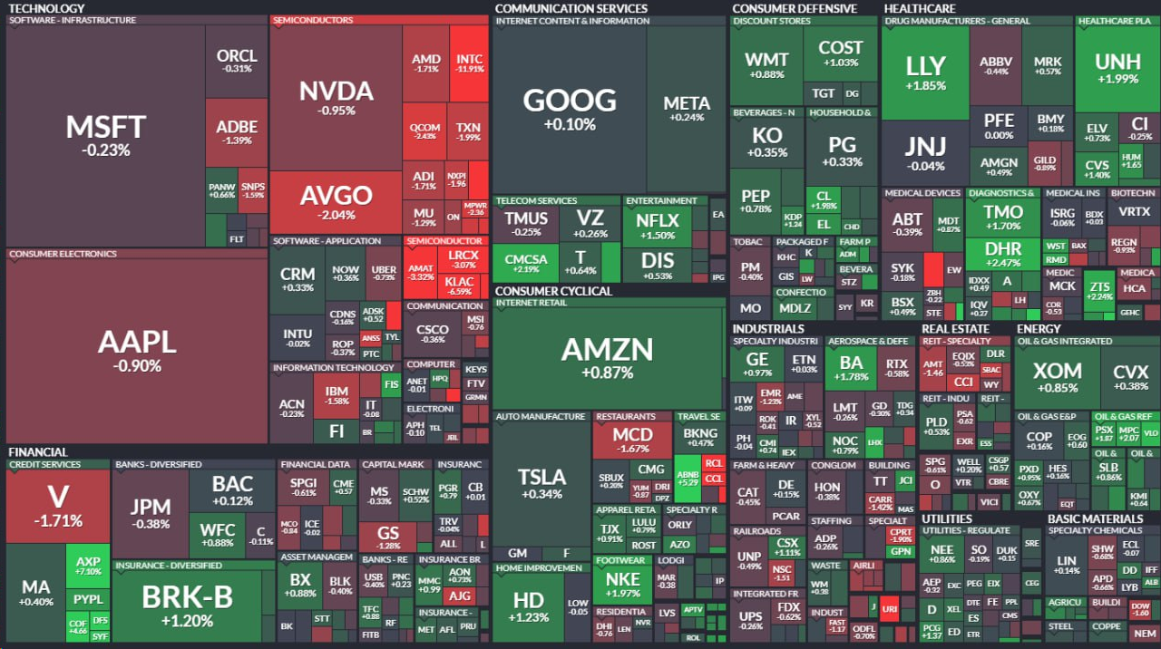 - 인텔(INTC)은 실적 하락 발표 후 11% 이상 큰 폭으로 하락.