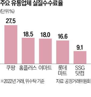 2. 쿠팡, 입점 업체 평균 수수료 27.5% → 이마트 등 대형마트 평균(17.7%)은 물론이고 다른 온라인 쇼핑몰(12.3%)의 두 배... 판매업체들 입점 후 매출은 수직 상승하지만 실익은 속빈 강정. 늘어나는 매출에 생산 시설 늘린 다음엔 빠져 나오기도 쉽지 않아.(한경)