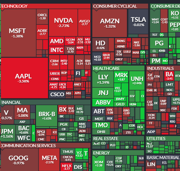 - 투자의견이 하향된 애플과 미 정부의 ASML의 반도체 제조 장비에 대한 대중국 판매 금지 조치 소식에 M7을 비롯한 주요 기술주와 엔비디아, AMD 등 반도체 업종도 동반 하락.