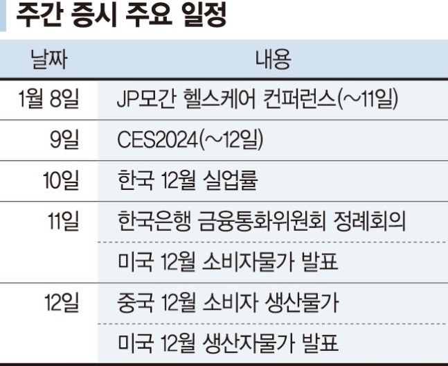 2. JP모건 헬스케어 컨퍼런스(1/8~11): 헬스케어 분야 최고의 컨퍼런스로 많은 기업들의 신약, 임상 등을 발표되며 이로인해 관련 기업들의 변동성이 확대. 이번 컨퍼런스에서는 암젠(AMGN), 일라이릴리(LLY), 에브비(ABBV), J&J(JNJ), 브리스톨마이어스(BMY), 모더나(MRNA), 버텍스(VRTX), 레제네론(REGN), 박스터(BAX), 덱스컴(DXCM), 월그린부츠(WBA), CVS 헬스(CVS) 등 많은 기업들의 발표가 준비되어 있음