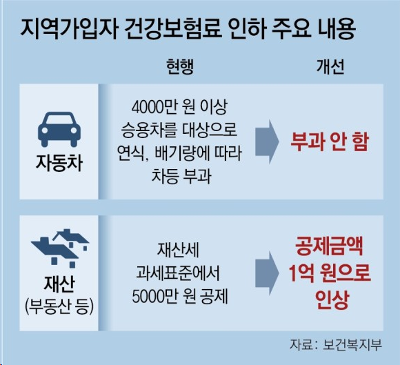 4. ‘지역가입자’ 건보료 월평균 2만 6000원 줄어 → 지역가입자 가구당 월평균 납부액 9만 2000원에서 6만 8000원으로 26% 줄어. 재산에 매겨지던 건보료 공제 늘리고 4000만원 이상의 자동차에 매겨지던 건보료도 폐지. 이로써 감소되는 건보료 수입은 9831억원 추정.(중앙선데이)