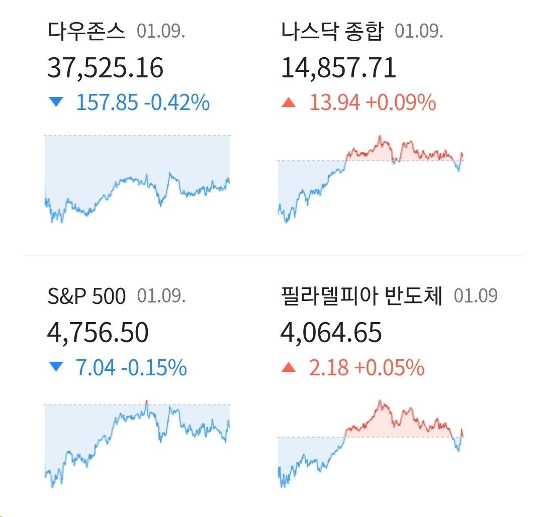 - 다우 -0.4%, 나스닥 +0.1%, S&P500 -0.2%, 러셀2000 -0.9%