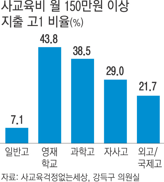2. 영재고 학생들 절반이 사교육비 월 150만원 이상 → 자사고, 과학고, 영재고, 외고학생들이 일반고에 비해 사교육비 더 많이 써. 월 150만원 이상 지출 ▷영재고 43.8%, ▷과학고 38.5%, ▷자사고 29%, ▷외고 21.7%... 일반고(7.1%)의 최고 6배.(경향)