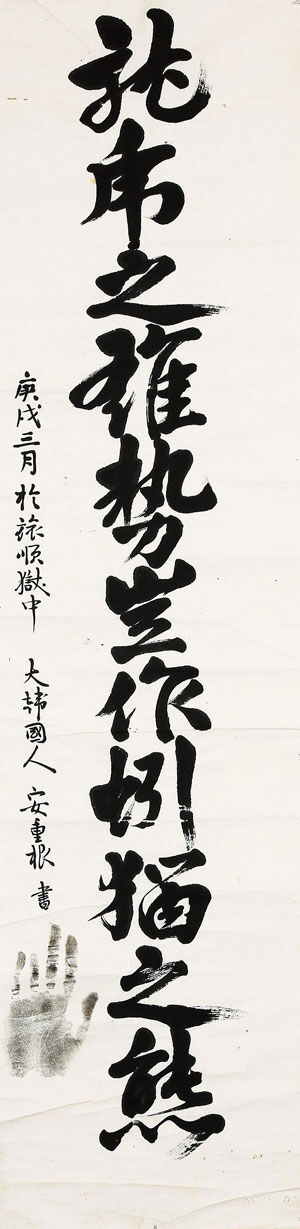 1. 19억 5000만원에 낙찰된 안중근 의사 붓글씨(▼) → 1910년 3월 여순 감옥에서 쓴 '龍虎之雄勢豈作蚓猫之態(용호지웅세기작인묘지태, 용과 호랑이의 용맹하고 웅장한 형세를 어찌 지렁이와 고양이의 모습에 비교하겠는가) 유묵, 일본인 소장자 경매 출품, 구입자는 한국인으로 알려져.(아시아경제)