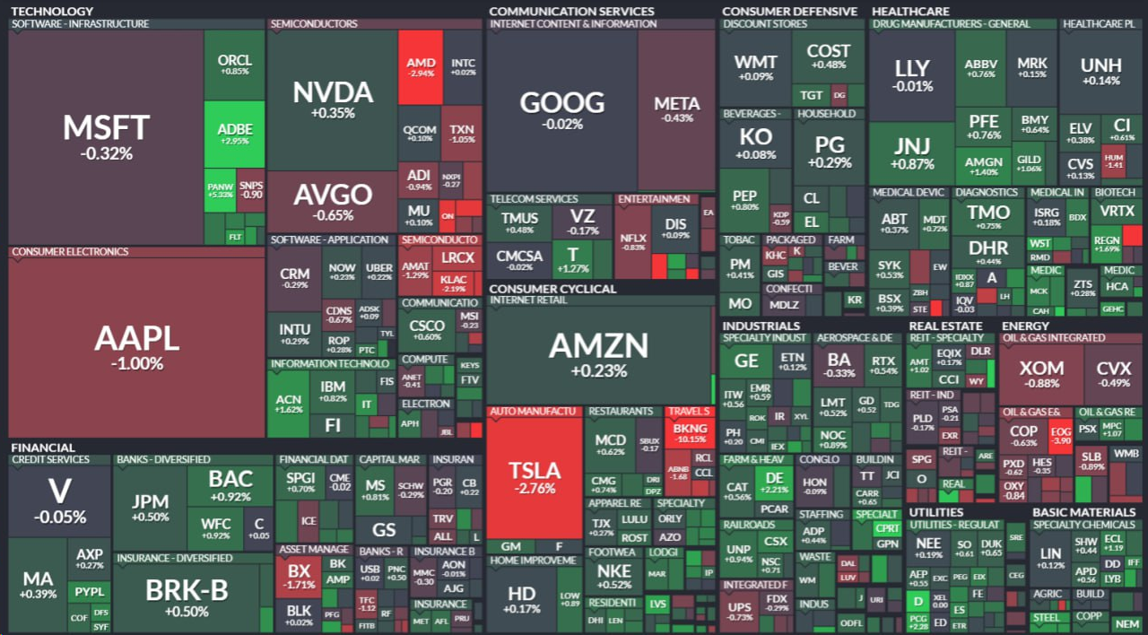- 마이크로소프트(-0.32%), 애플(-1.0%), 알파벳(-0.02%), 메타(-0.43%), 테슬라(-2.76%) 등 하락세를 보임.
