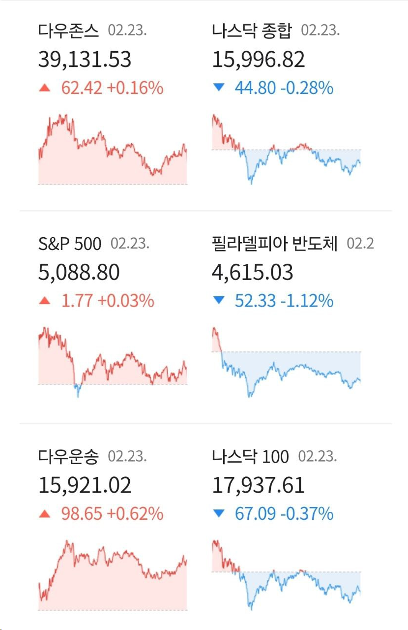 - 2/23 금요일 - 어제 급등 후 3대 지수 랠리 주춤하며 혼조 마감.