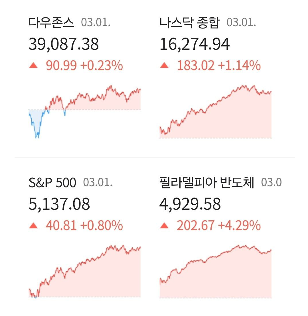 - 나스닥, S&P 500 상승, 다우 약보합. - 반도체가 상승 주도하며 3대 지수 상승. -