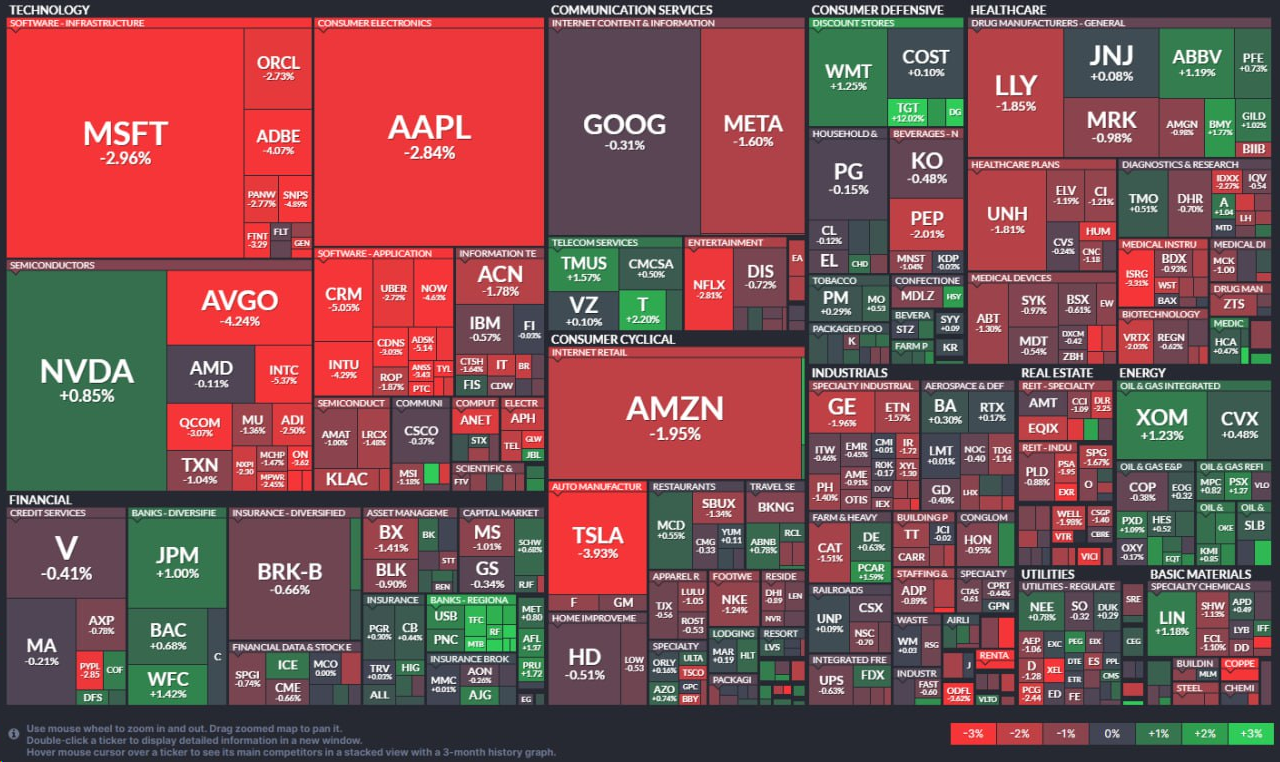- 애플, 테슬라, AMD 등이 큰 폭 하락하며 지수 약세