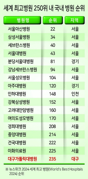 2. 뉴스위크 선정 ‘2024 세계 최고 병원(World’s Best Hospitals 2024)‘ → 총 250위 권내 한국 병원 17곳. ▷서울아산병원이 22위 최고, 이어 ▷삼성서울병원(34위) ▷세브란스병원(40위) ▷서울대병원(43위) ▷분당서울대병원(81위) ▷강남세브란스병원(94위)이 100위 안.(헤럴드경제)▼