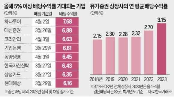 6. 상장기업 평균 배당률 3.15% → 은행 예금 못지 않아. 최고 배당률은 하나투어로 7.68%, 이어서 대신증권(6.88%), 코리안리(6.63%), 기업은행(6.61%), 동양생명(6.45%), 한국자산신탁(6.43%), 삼성카드(6.35%) 등이 6% 넘어.(한경)▼