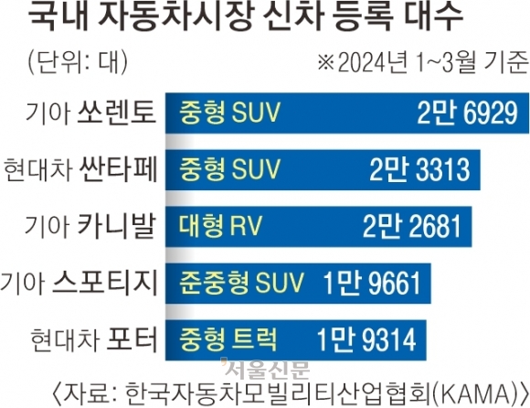 9. SUV 인기 계속 → 판매량 상위 5위까지 전부 SUV... 세단형 1위 그랜져가 전체 판매량에서 겨우 6위. 2020년 1분기만 해도 5위 안에 그랜저, K5, 쏘나타 등 3개가 들 정도로 세단형이 대세였지만 지금은 완전 역전.(서울)▼