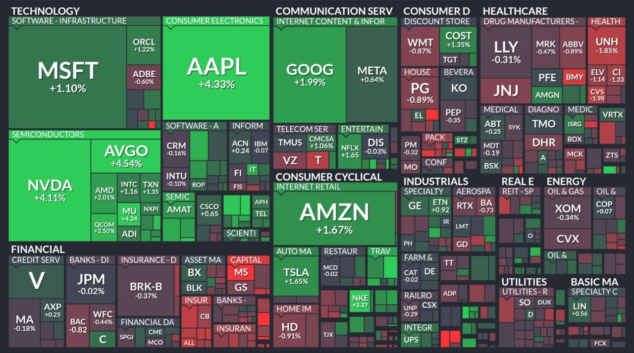 - AI 기대에 애플 +4.3%, 엔비디아 +4.1%, 아마존 +1.7% 등 상승