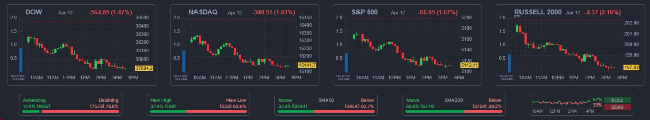 - 낮아진 금리 인하 기대감, 주말 동안 이란의 이스라엘 보복 공격 가능성에 3대 지수 모두 -1% 이상 하락. -