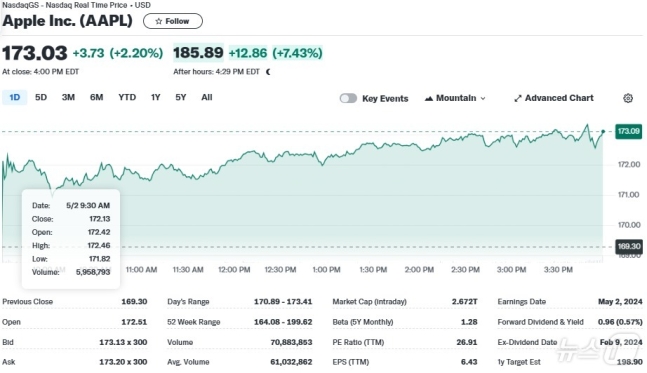 - 장마감 후 실적을 발표한 애플, 예상을 상회하는 24년 2분기 실적 발표(시간외 +7.4%)