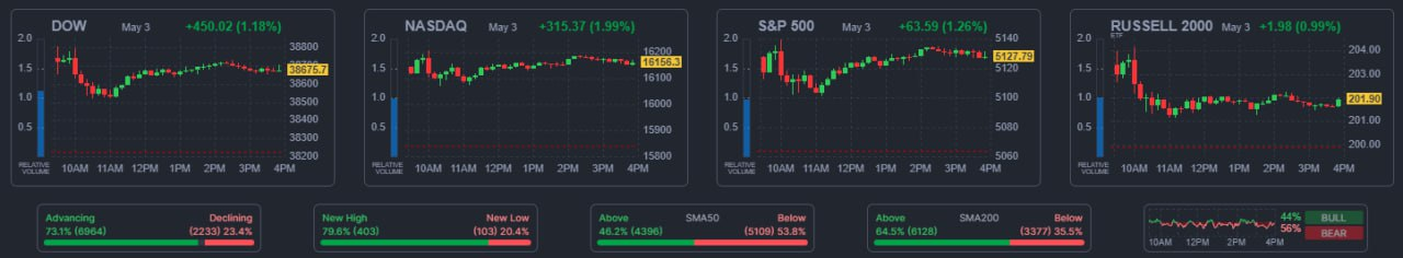 - 다우지수 1.2% 상승, S&P 500 1.3% 상승, 나스닥 2.0% 상승 마감