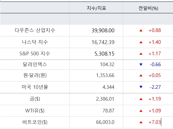 - NVIDIA는 3% 이상 상승. 애플과 마이크로소프트도 1% 이상 상승하며 기술주들이 강세. -