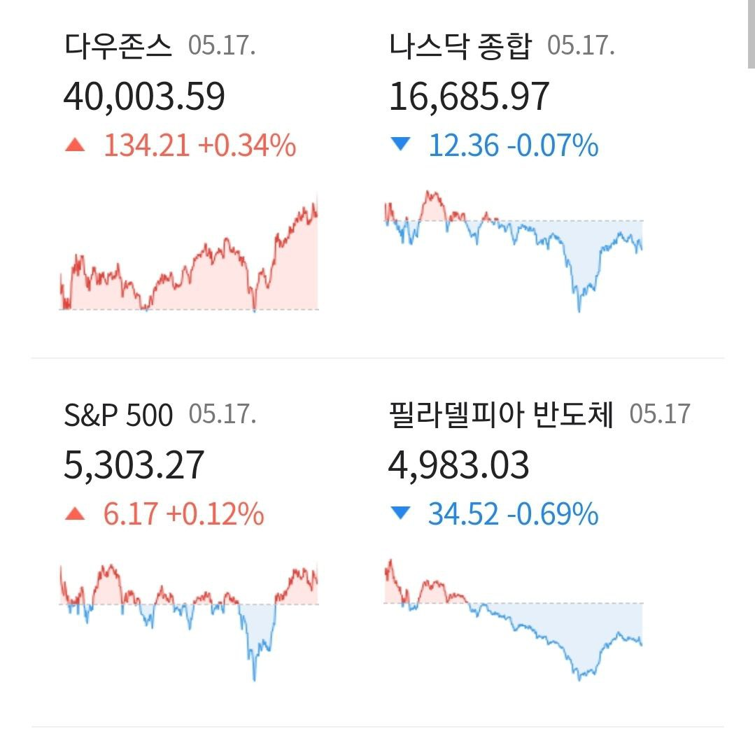 - 우의 날…다우 첫 4만선 돌파 마감 - 3대 지수 혼조 마감. 다우 지수 4만 포인트 상회하여 마감. -