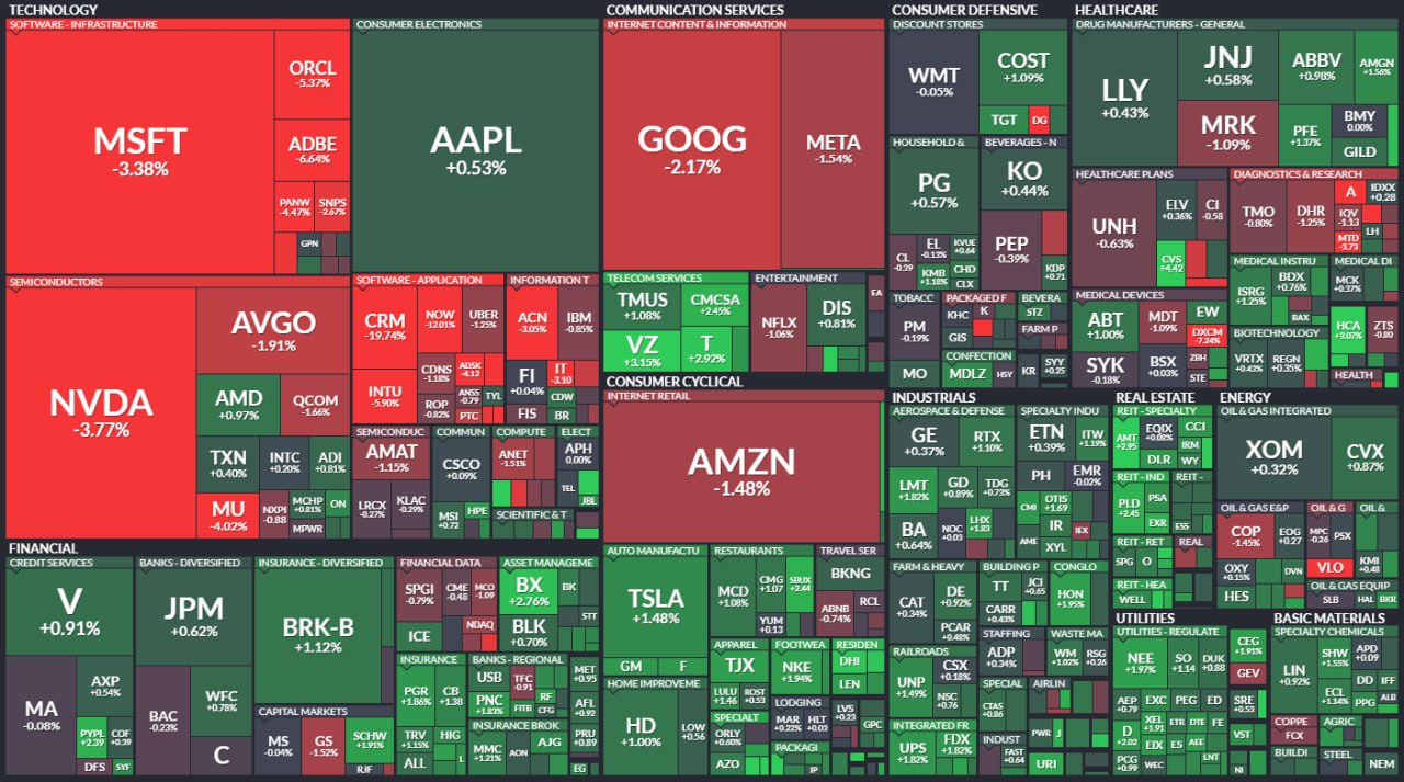 - 기술 섹터 하락은 세일즈 포스 $CRM 실적 발표후 떡락(-20%)으로 인한 마이크로소프트 $MSFT 포함 소프트웨어 업종의 동반 폭락, 엔비디아 $NVDA 차익 실현이 주도.